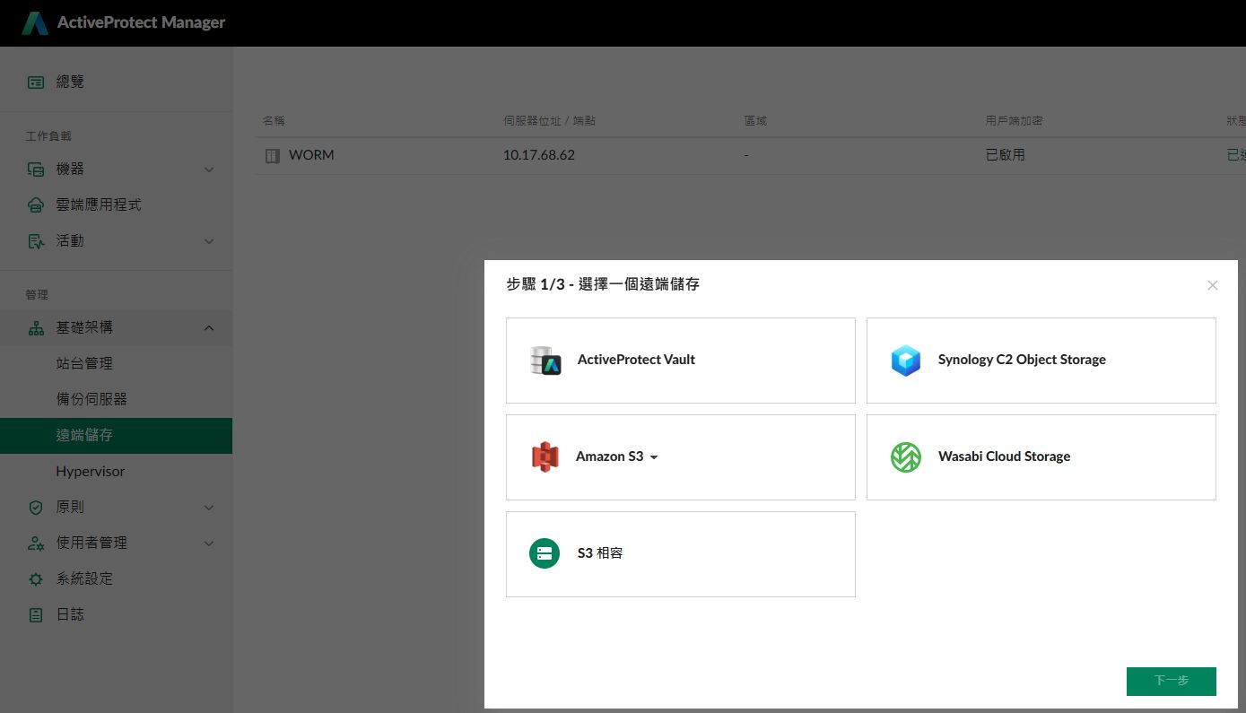 關於備份目的地的儲存分層(遠端儲存)應用上,APM既有版本可支援群暉自家的儲存設備,像是已安裝ActiveProtect Vault套件的NAS設備、SA系列與HD系列,以及雲端物件儲存服務,如AWS的Amazon S3、群暉C2 Object Storage。到了新登場的APM 1.1,額外支援Wasabi Cloud Object Storage、其他相容於S3的儲存系統,以及特定XS/XS+型號的群暉NAS設備,可針對資料長期保存與釋放備份伺服器儲存空間的需求,提供更多選擇彈性。