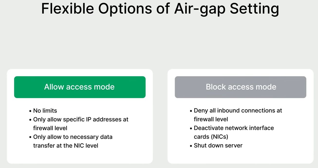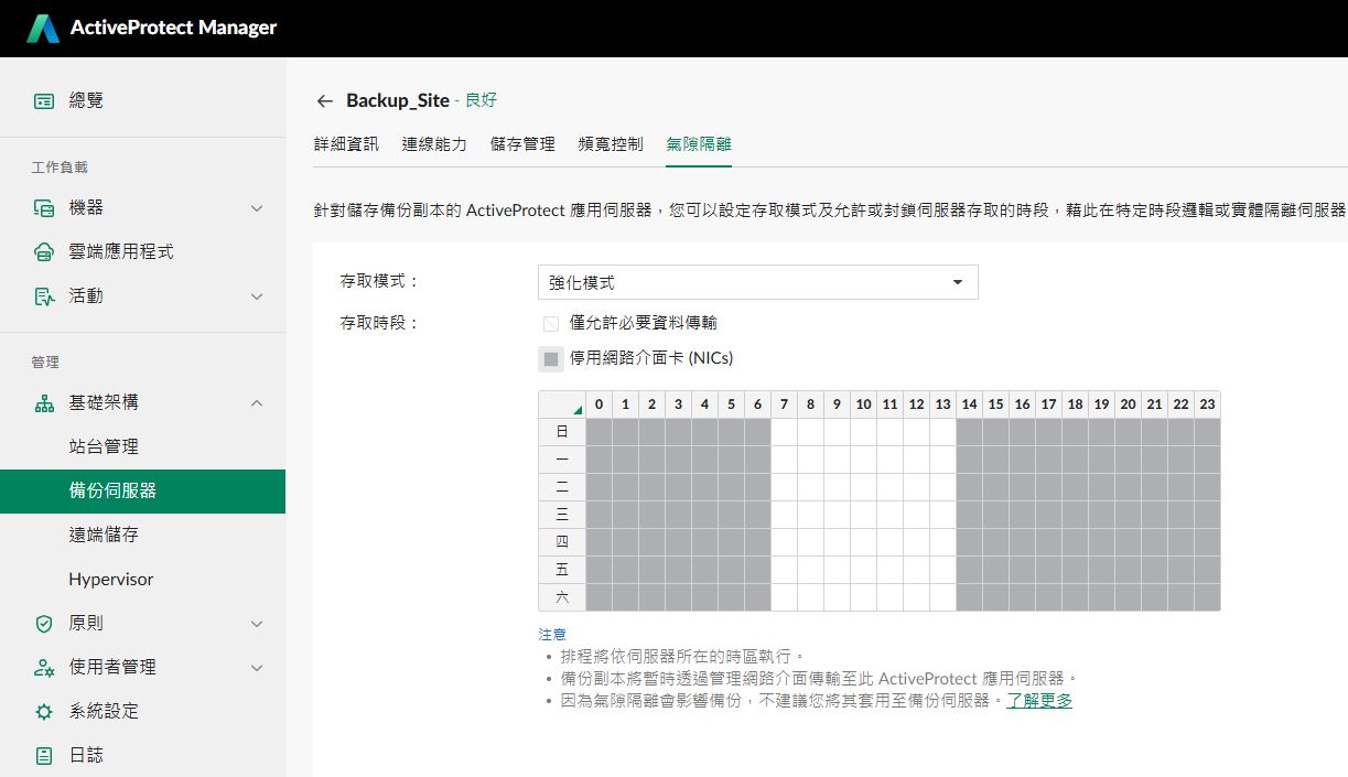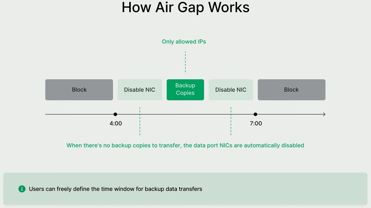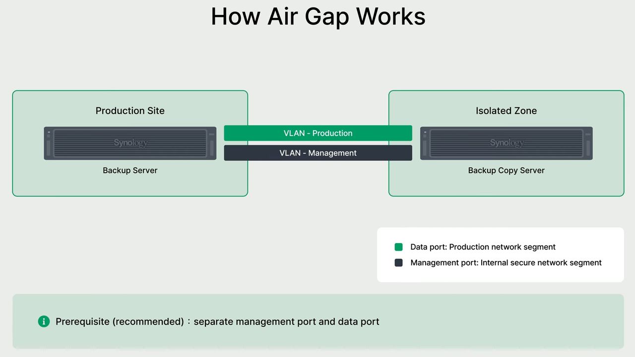 關於資料存取的防護,APM新增「允許存取模式(Allow Access Mode)」,能夠更精細地控管網路存取,例如,在備份作業執行期間,僅允許列於白名單的IP位址連入系統,一旦備份工作完成或提前結束,系統會自動轉換為完全隔離模式,藉此確保備份資料的安全性。群暉在此提供氣隙隔離(air-gap)設定選項,能限定備份伺服器只能在接到備份副本或處於儲存分層作業實,才能啟動資料傳輸專用的網路介面卡。