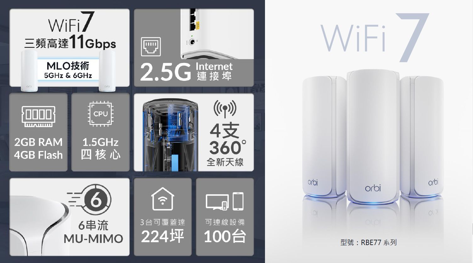 就無線與有線網路規格而言,去年10月在臺開賣的Orbi 770系列,支援6個無線網路串流,採用2x2天線架構,Wi-Fi效能達到11 Gbps(688 Mbps、4,320 Mbps、5,760 Mbps),可支援100臺設備的Wi-Fi連網,路由器內建6個2.5 GbE網路埠,衛星延伸器搭配1個2.5 GbE網路埠。