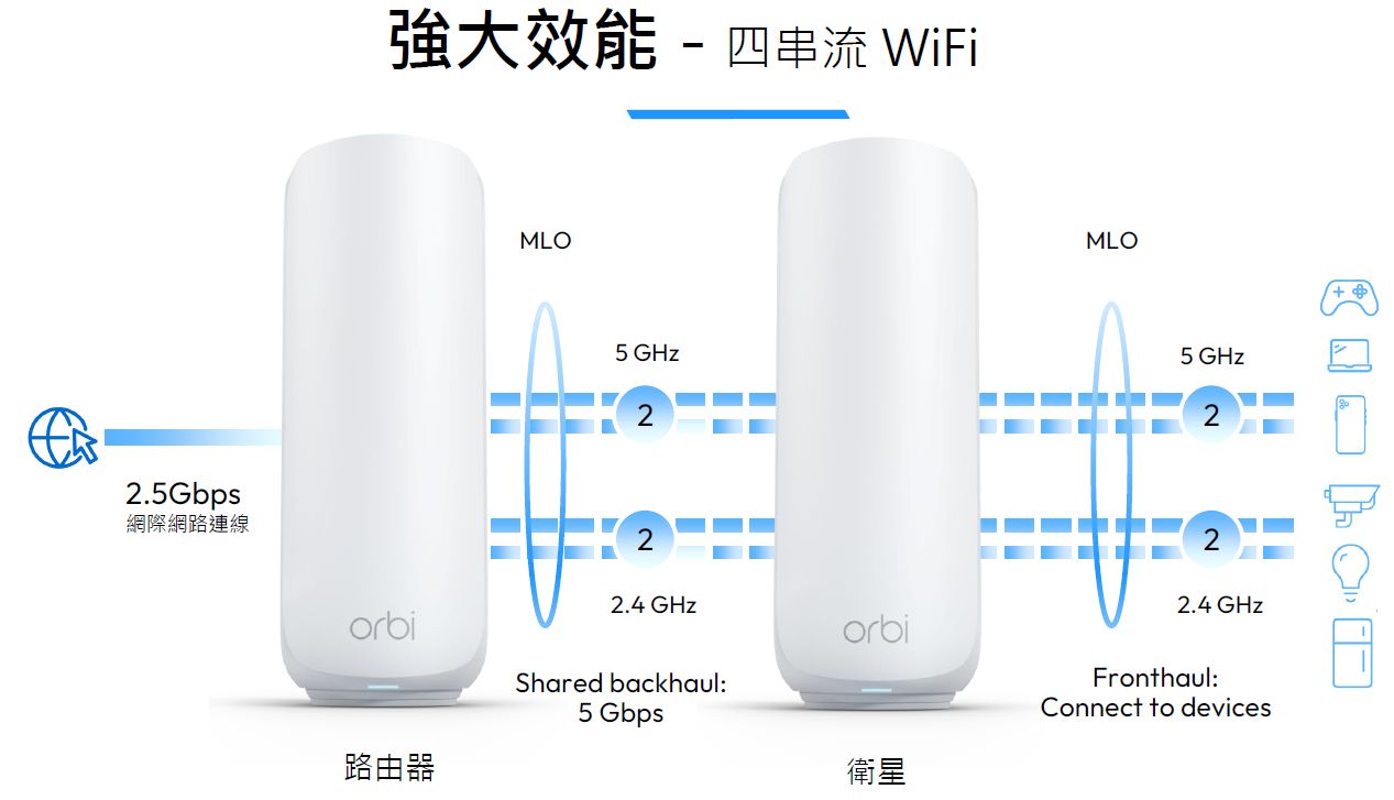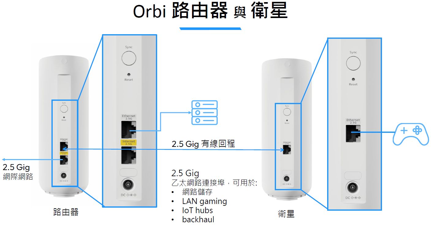 ●網路埠:Orbi路由器有2個2.5 GbE埠,Orbi衛星延伸器有1個2.5 GbE埠