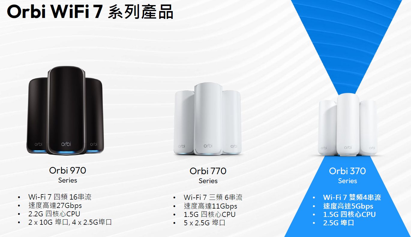 關於Wi-Fi 7等級的家用Wi-Fi Mesh網路基地臺產品,Netgear從2023年下半起,陸續推出主打極致效能的Orbi 970系列、鎖定中階家用市場的Orbi 770系列,去年9月代理商瀚錸科技宣布在臺推出這兩款機型。