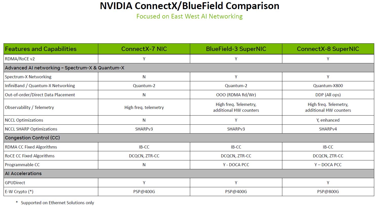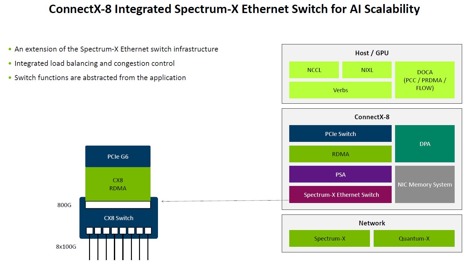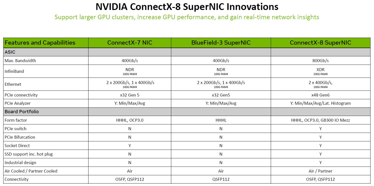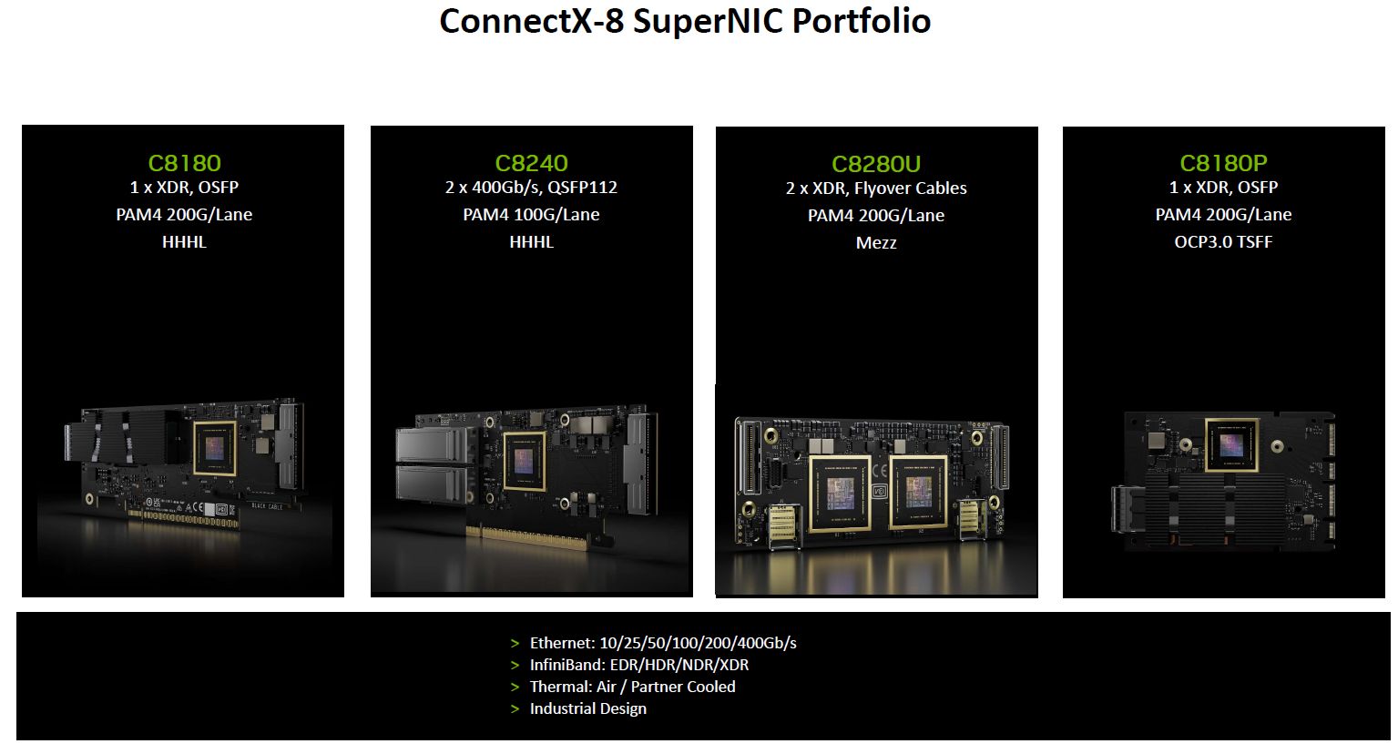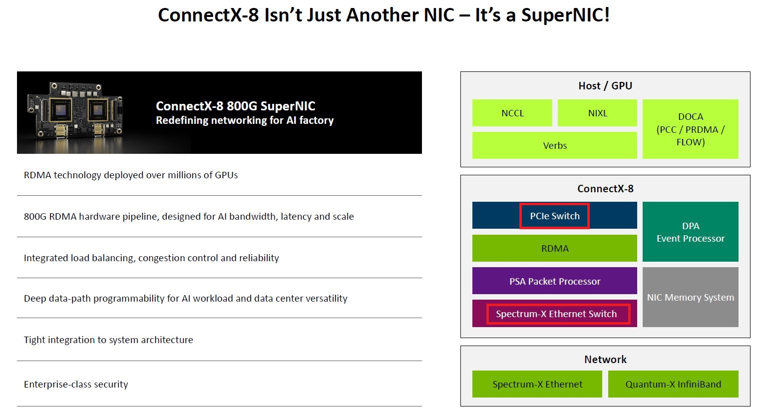 到了10月2024 OCP全球高峰會期間,Nvidia宣布Spectrum-X乙太網路平臺將包含ConnectX-8 SuperNIC,支援OCP的交換器抽象層介面(SAI)與開放網路作業系統SONiC,用戶能善用Spectrum-X的自我調適路由,以及基於遙測機制而成的網路壅塞控制功能,能夠針對橫向擴展執行規模的AI基礎架構,加快乙太網路傳輸效能,他們也強調ConnectX-8 SuperNIC的網路速度可提升至800 Gb/s,本身也內建可程式化的封包處理引擎,可針對超大規模AI工作負載提供最佳化處理能力,並預告隔年將推出OCP 3.0外形的ConnectX-8 SuperNIC。