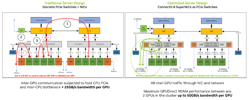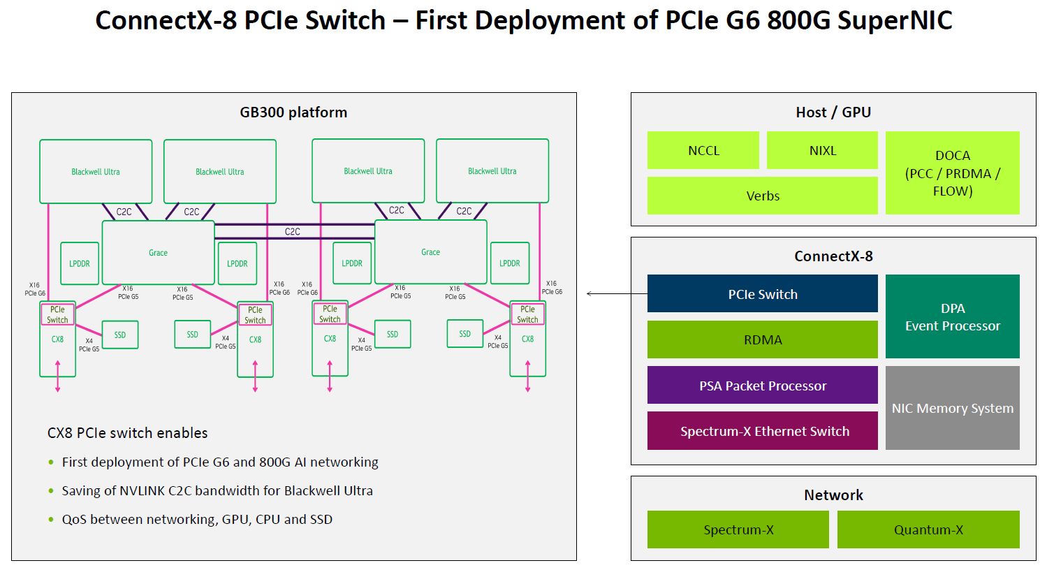 Nvidia表示,在傳統的架構設計上,會面臨多個CPU插槽之間的存取瓶頸,最大只能到25 GB/s,若改用針對ConnectX-8 SuperNIC最佳化設計,因為NCCL可經由網路直接指引流量傳輸的路由,在叢集內部的每個GPU對應到的所有CPU互連通訊I/O頻寬,可提升至50 GB/s。而且,因為ConnectX-8 SuperNIC配備PCIe 6.0交換器,提供兩倍於PCIe 5.0交換器的I/O頻寬,也能顯著加快GPU之間的資料傳輸速度。