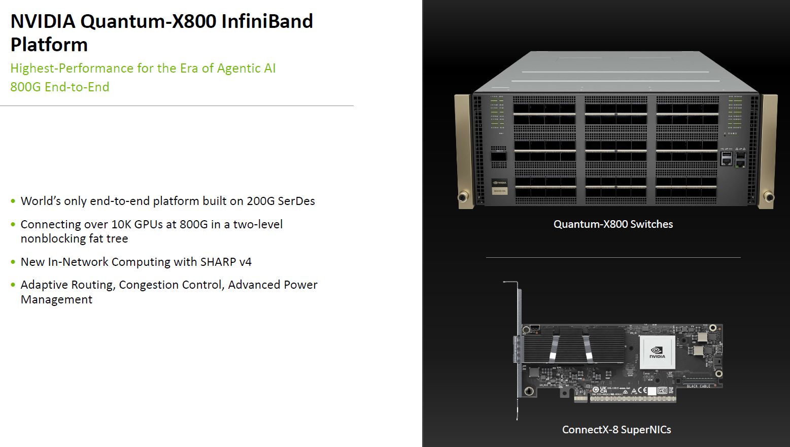 繼2021年發表資料中心等級的網路卡ConnectX-7,在2024年3月GTC大會期間,Nvidia發表800 Gb/s乙太網路與InfiniBand網路解決方案,當中不僅介紹Spectrum-X800、Quantum-X800這兩大平臺,也釋出下一代產品的消息:Spectrum-X800將包含Quantum Q3400與ConnectX-8 SuperNIC,網路頻寬容量將提高5倍,網內運算提升9倍、達到14.4 TFLOPS,並且支援第四代的分層彙總與精簡通訊協定(SHARPv4)。