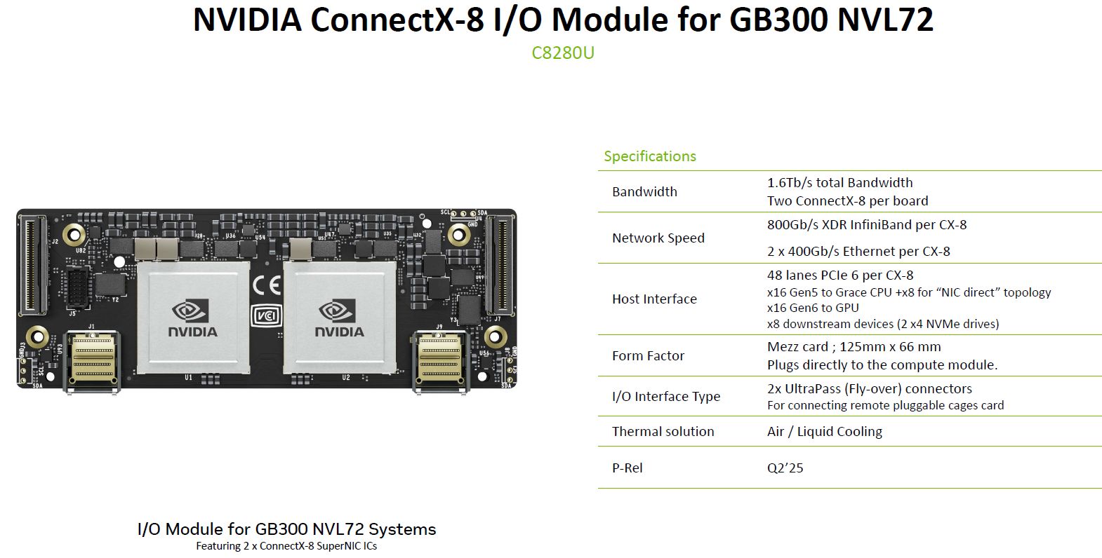 2025年3月GTC大會期間,Nvidia宣布兩大產品線將搭配ConnectX-8 SuperNIC,首先是新一代AI工廠平臺Blackwell Ultra,當中的多機櫃方案GB300 NVL72,以及伺服器系統HGX B300 NVL16,都將整合Spectrum-X800、Quantum-X800,而這兩大網路加速平臺也包含ConnectX-8 SuperNIC;