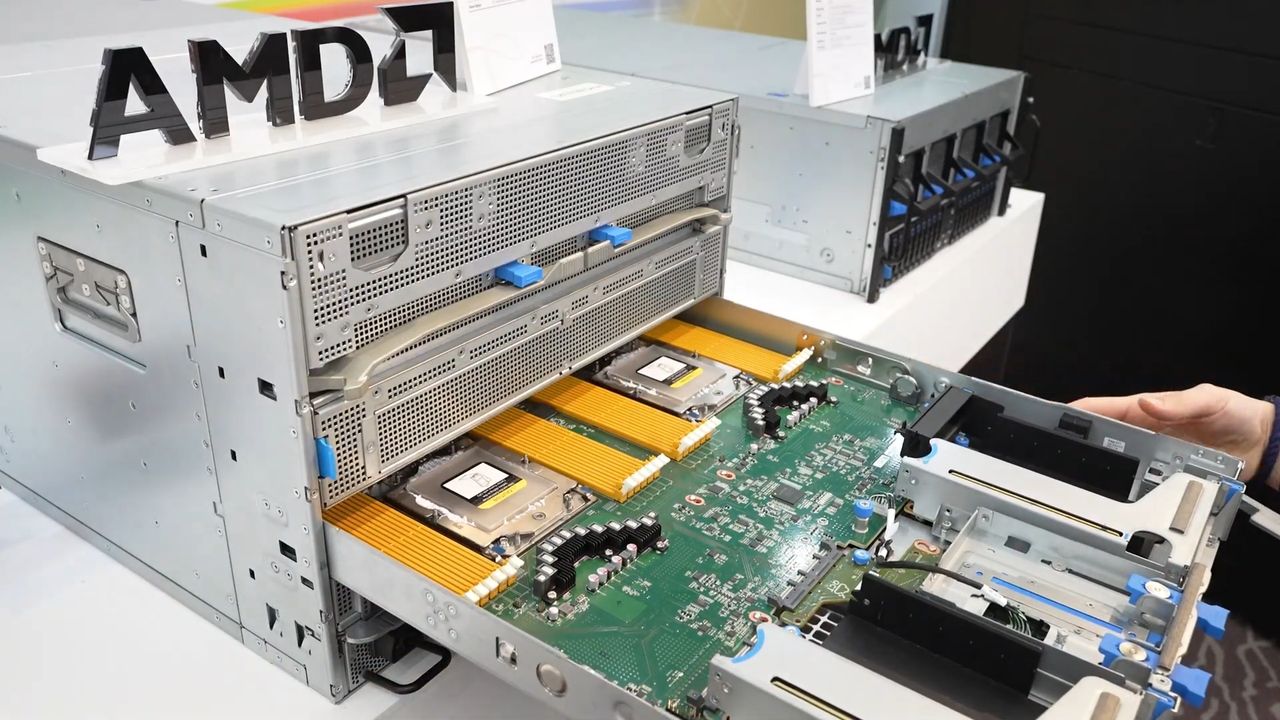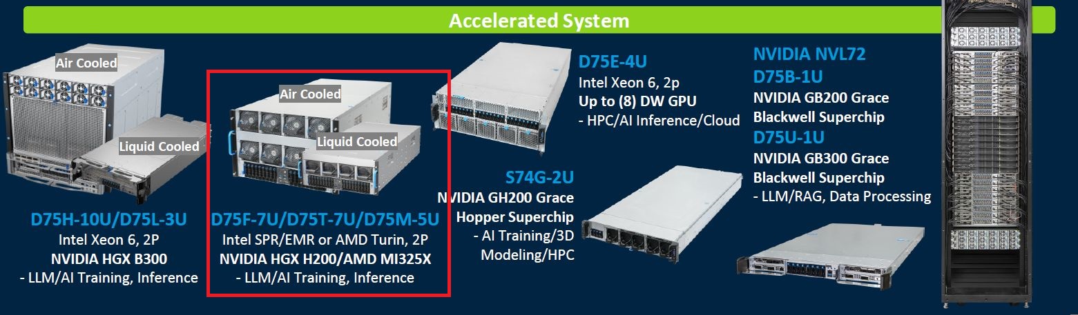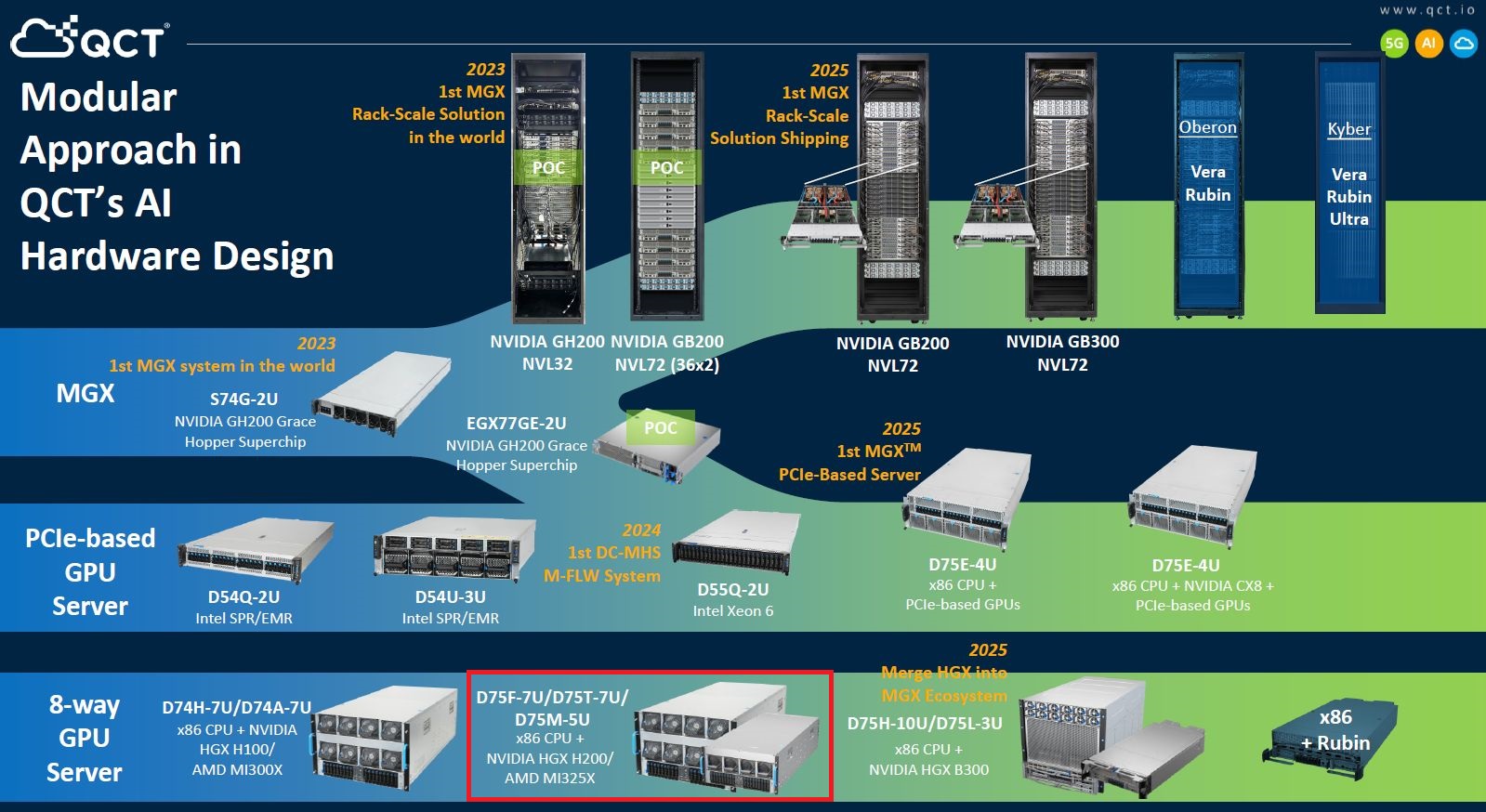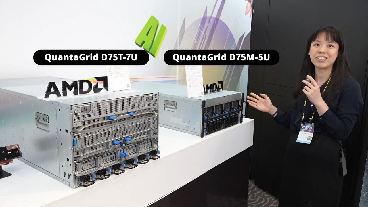 去年6月AMD發表新款資料中心GPU平臺(採用Instinct MI350X系列),前一個月的2025台北電腦展期間,就有多家伺服器廠商宣布推出相關產品,例如,雲達科技(QCT)就在活動現場展出導入這個平臺的兩款機型:7U機箱、採用氣冷散熱的QuantaGrid D75T-7U,以及5U機箱、採用液冷散熱的QuantaGrid D75M-5U,它們均搭配兩顆AMD EPYC 9004/9005系列處理器,最高可搭配熱設計功耗(TDP)為500瓦的款式,單一伺服器能提供384顆實體核心、768顆執行緒;系統記憶體方面,這兩款機型都內建24個DDR5記憶體插槽,支援6400 MT/s,若全部使用128 GB容量的記憶體,整臺伺服器可提供到3 TB記憶體。