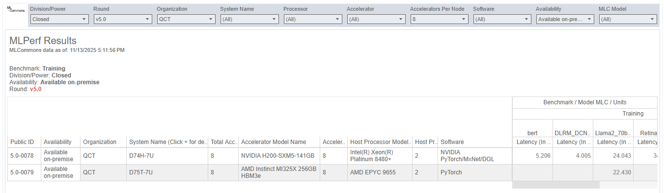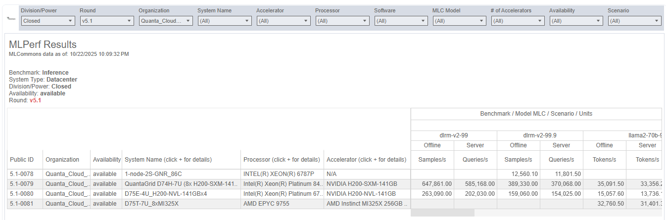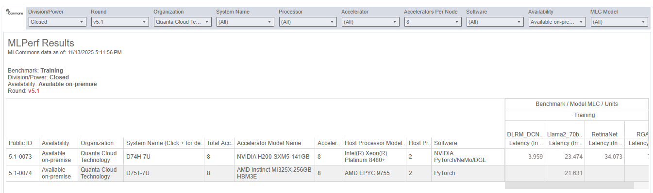 對照ML Commons組織在2025年公布的AI伺服器效能測試結果,也可以呼應上述市場主打產品策略。例如,6月揭露的MLPerf Training v5.0,9月推出的MLPerf Inference v5.1,11月發布的MLPerf Training v5.1,都可以看到雲達提交D75T-7U的AI運算效能表現。