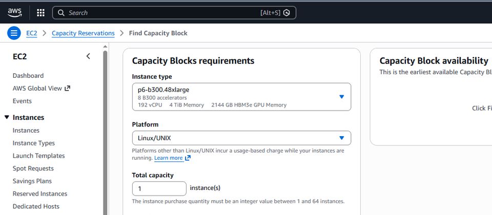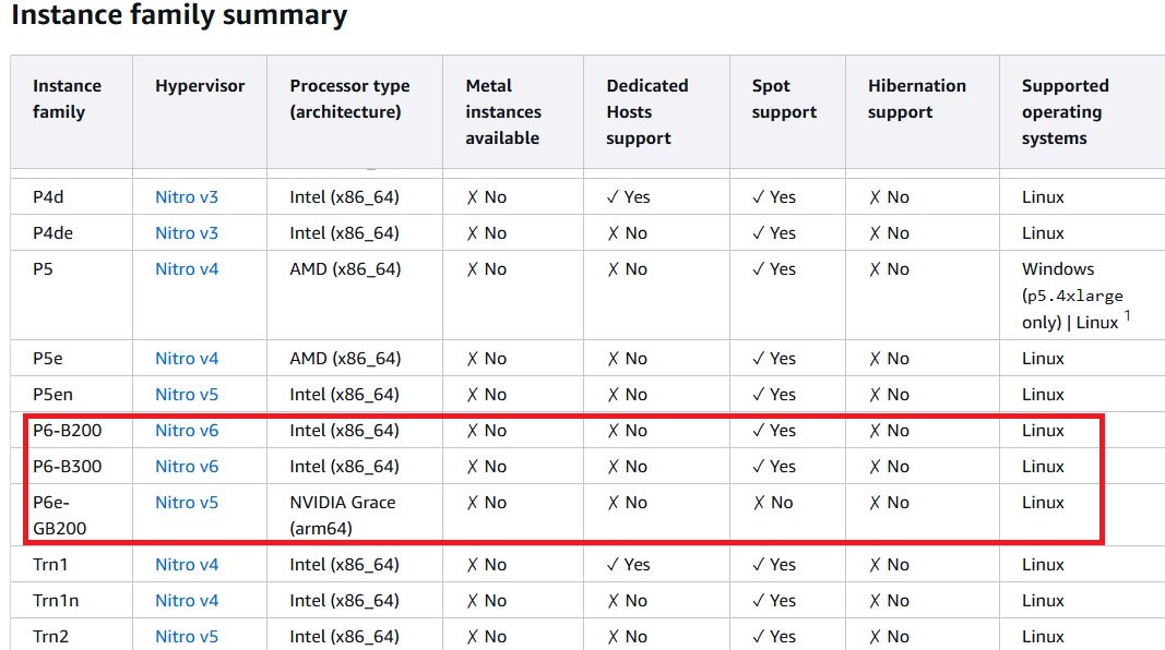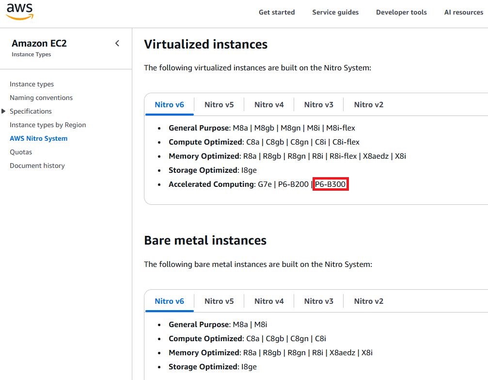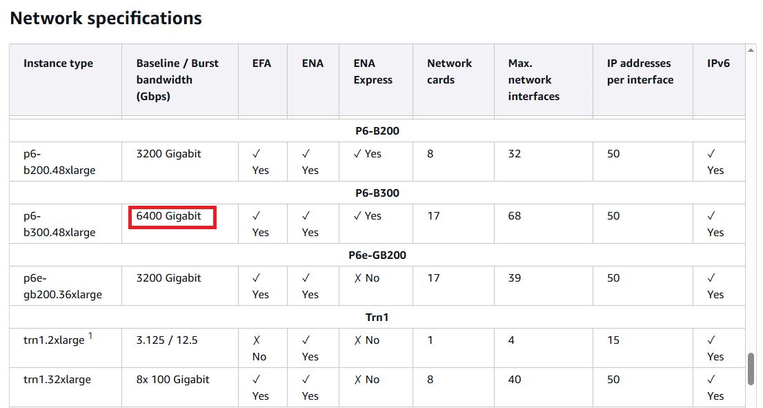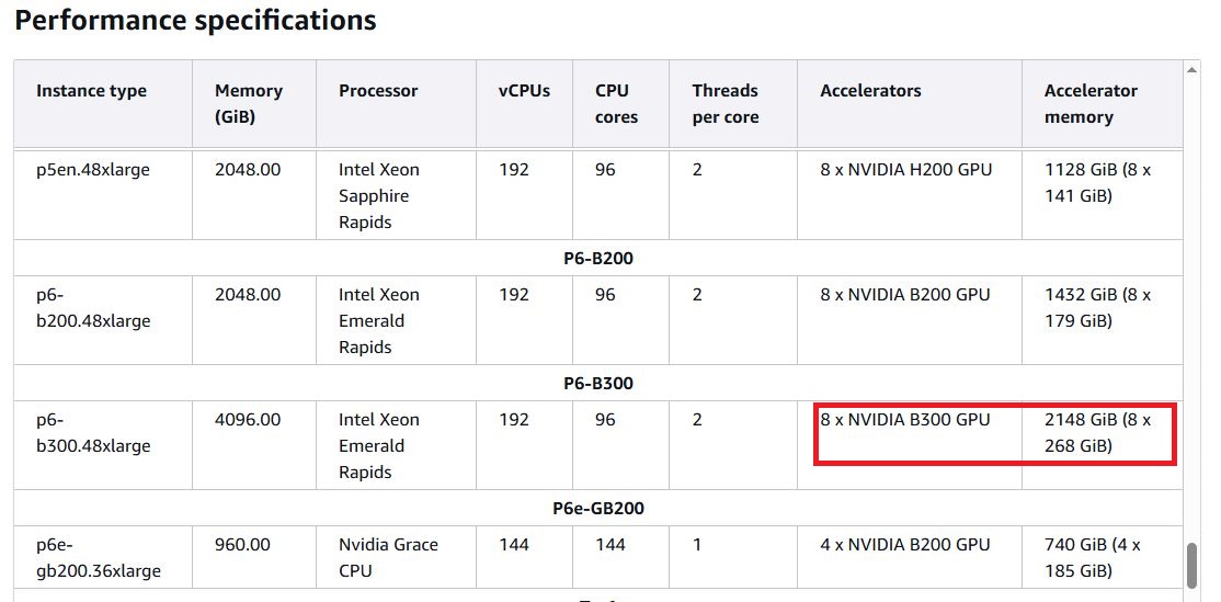 p6-b300.48xlarge,192顆虛擬處理器、4 TiB記憶體、30.72 TB本機儲存(8臺3.84 TB)、8個Nvidia B300 GPU、網路頻寬為6400 Gbps,網路儲存:使用AWS區塊儲存服務EBS,存取頻寬為100 Gbps