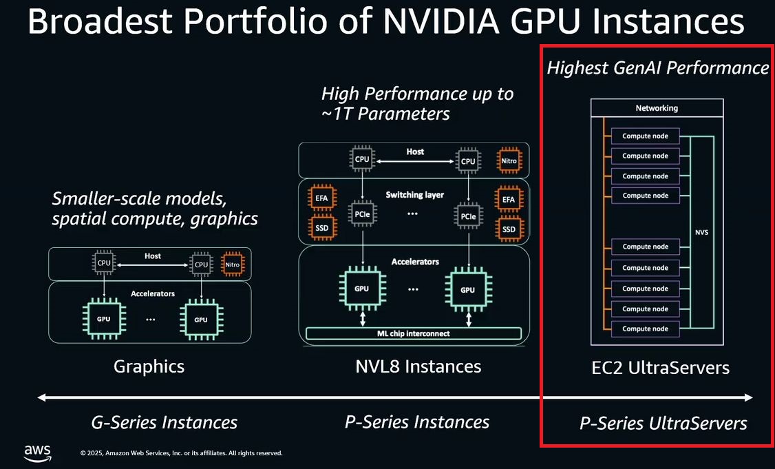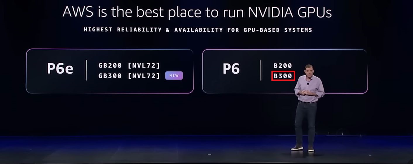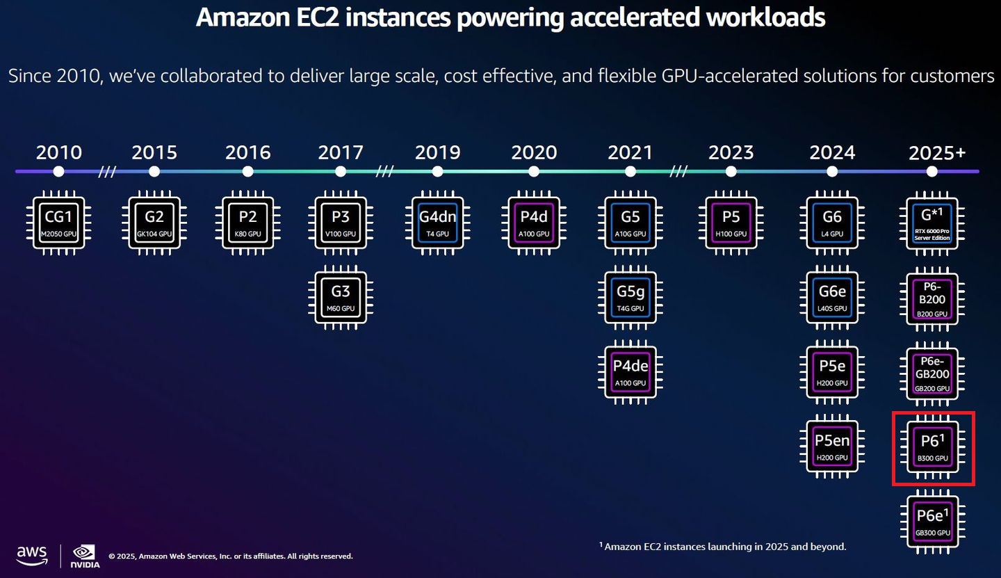 去年AWS陸續推出導入Nvidia Blackwell架構GPU的加速運算服務,例如5月正式推出的P6、7月上線的P6e-GB200,搭配的GPU產品分別為B200、GB200。