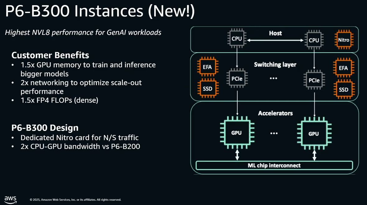 如同稍早推出的P6-B200,P6-B300僅提供一種執行個體組態,分別是p6-b300.48xlarge與p6-b200.48xlarge,系統記憶體內建4 TB與2 TB,同樣搭配96顆核心的英特爾第五代Xeon Scalable系列處理器,提供192個虛擬處理器,以及8個B300 GPU。