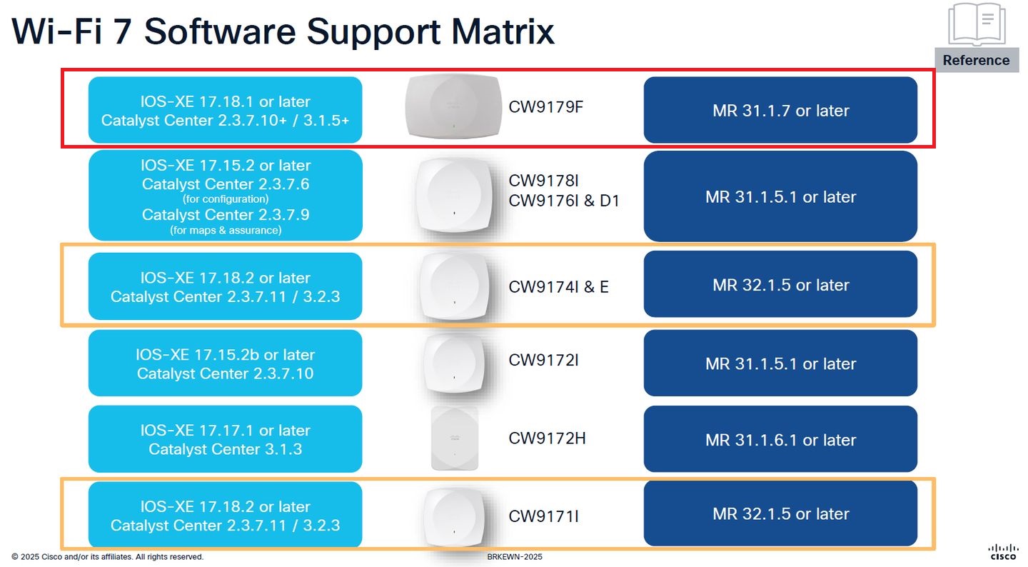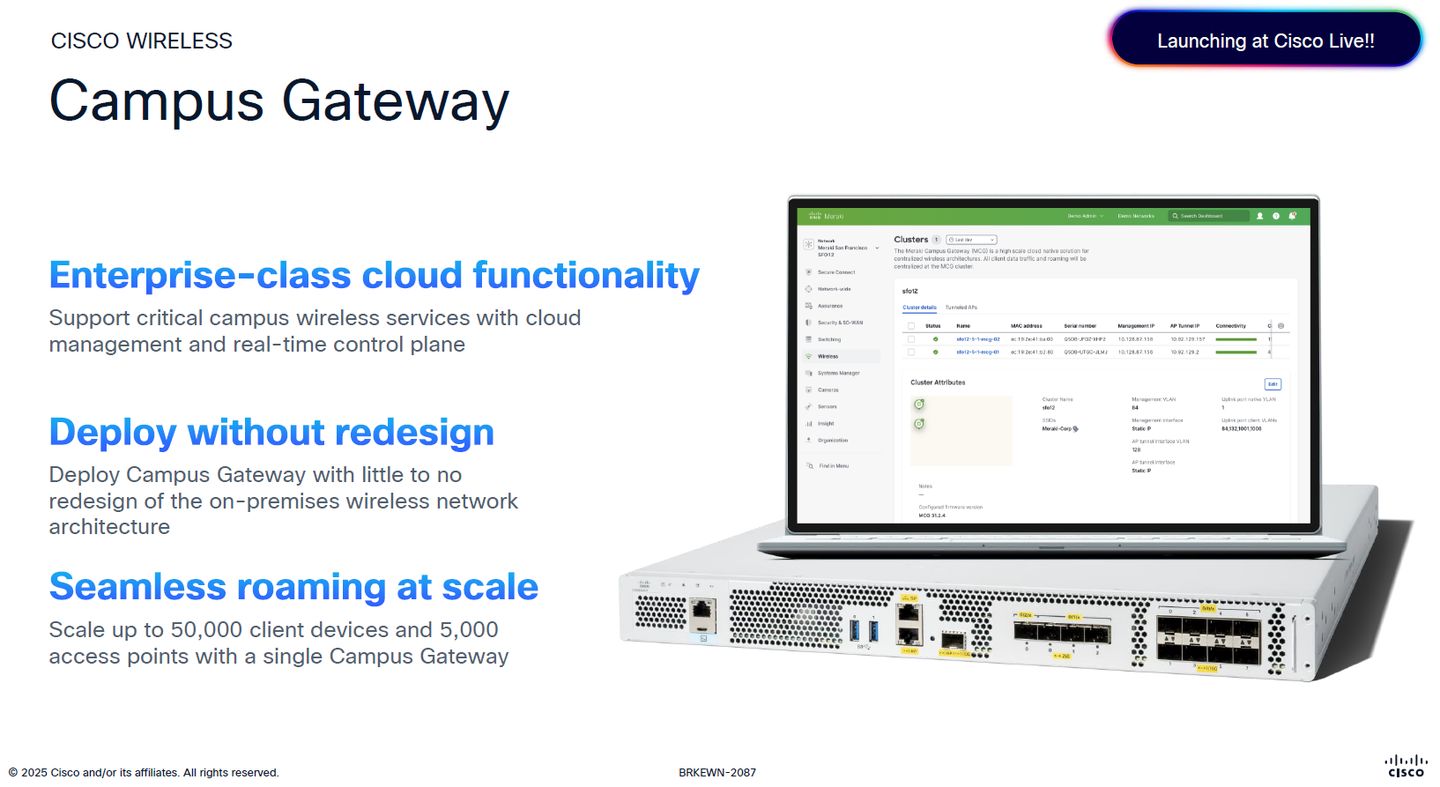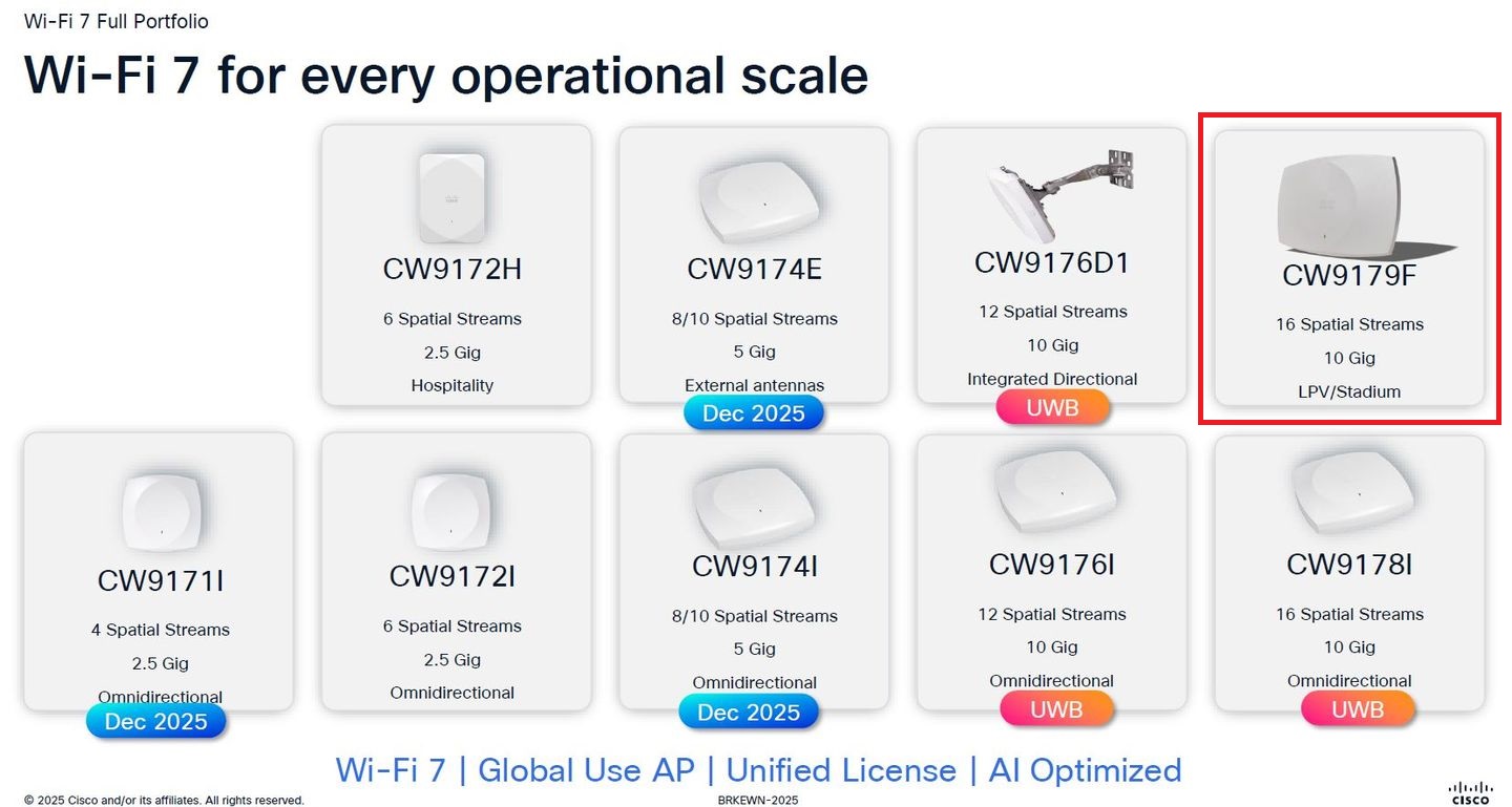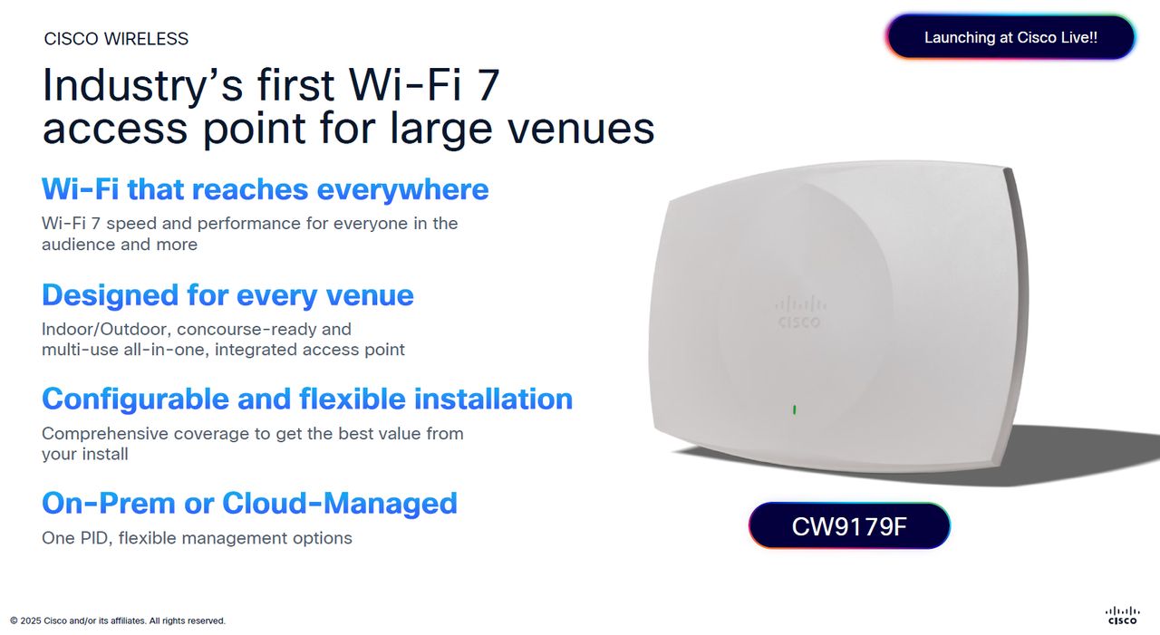 持續拓展企業Wi-Fi 7無線網路解決方案,思科在2025年6月舉行的年度用戶大會期間,發表最高規格的無線基地臺機型Cisco Wireless 9179F(CW9179F),鎖定體育館、會議中心、機場、慶典活動等大型公共空間或場館的無線網路連線需求,可搭配當時一同推出的Cisco Campus Gateway,企業可透過支援雲端原生與企業內部管理的網路流量轉送閘道設備,為大型園區網路環境,提供連線順暢、可經由雲端服務管理的上網漫遊體驗(cloud-managed roaming)。