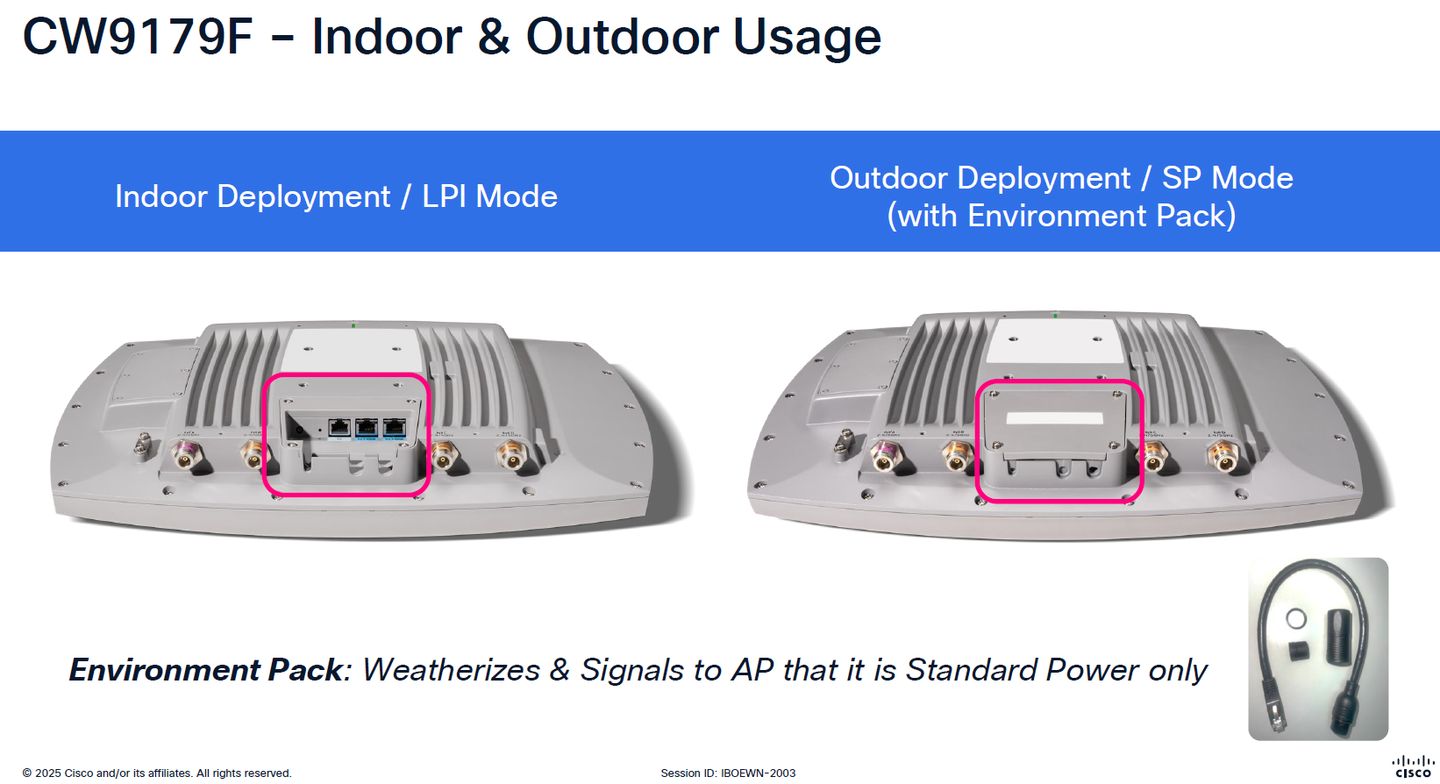 值得注意的是,CW9179F本身可同時支援室內與戶外環境的部署,思科表示,搭配思科特製的環境設置套件(Environment Pack),即可因應場地設計與現場建置的需求,將此機型轉為適用於現地部署的狀態。