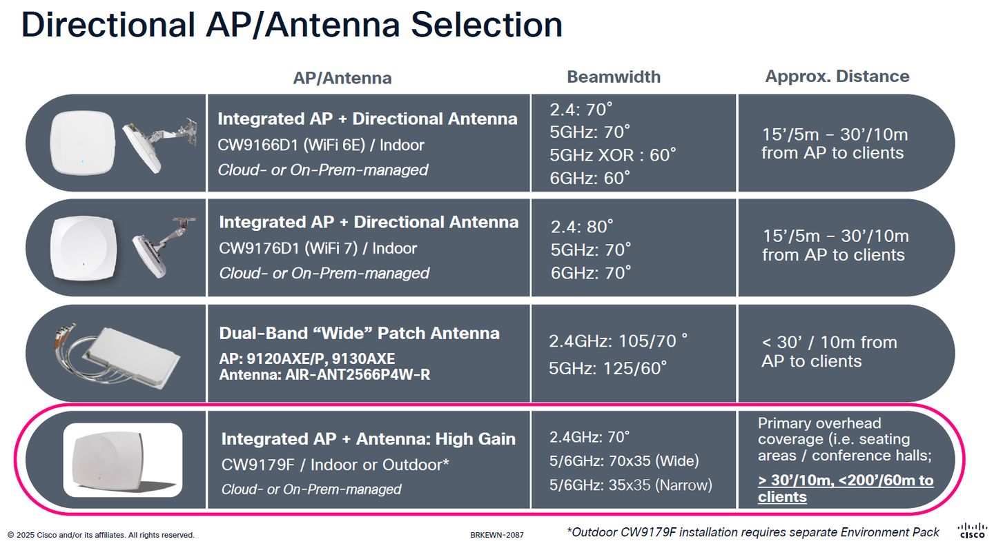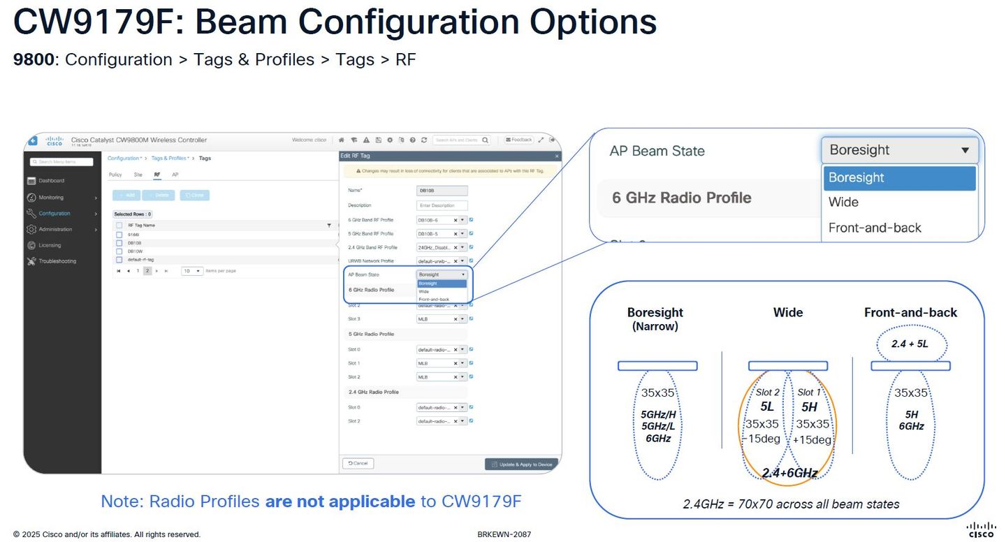 關於無線通訊頻率的配置,CW9179F特別支援可透過軟體控制的波束切換功能(software-controllable beam switching),思科提供三種調整天線訊號傳輸模式的軟體設定組態:窄域/視軸(boresight)、寬域(wide)、前後(front & back),用戶可選擇不同的波束訊號覆蓋方式。同時,此機型也提供連接外部天線的能力,協助用戶獲得足夠的訊號。