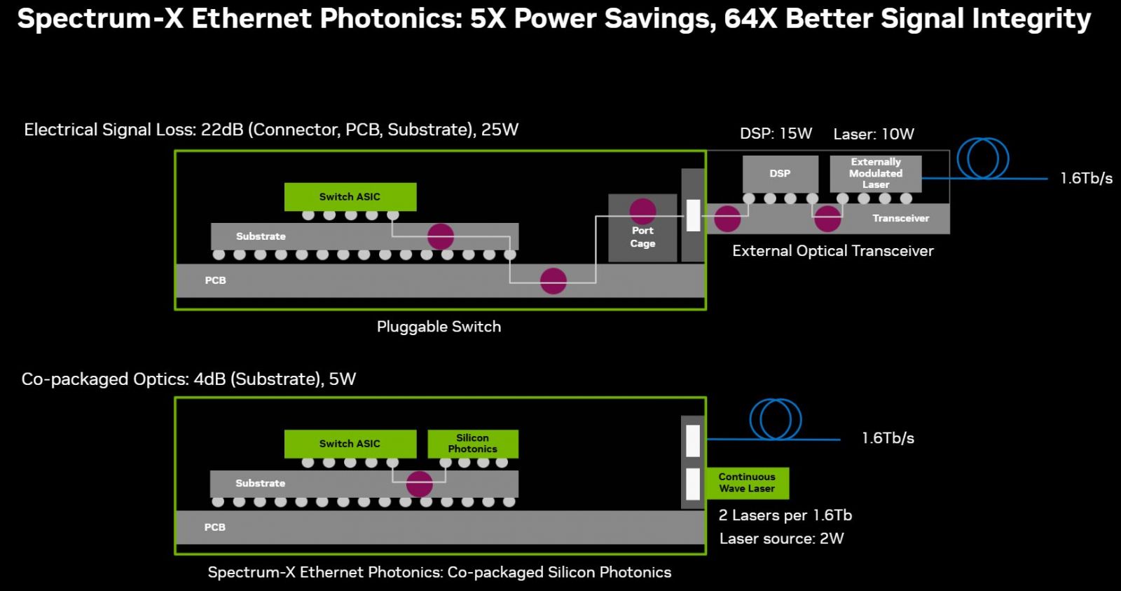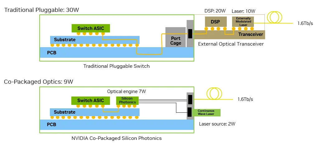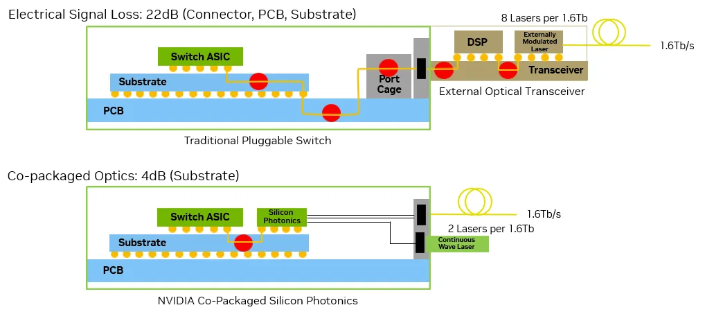 到了8月下半舉行的Hot Chips年度大會,Nvidia針對矽光子網路交換器揭露更多產品技術細節,也發布兩篇部落格文章,說明他們發展的共同封裝光學網路(CPO)技術差異,以圖解方式對比電子訊號損失程度與耗電量的大幅改善,以及與台積電合作開發的過程。