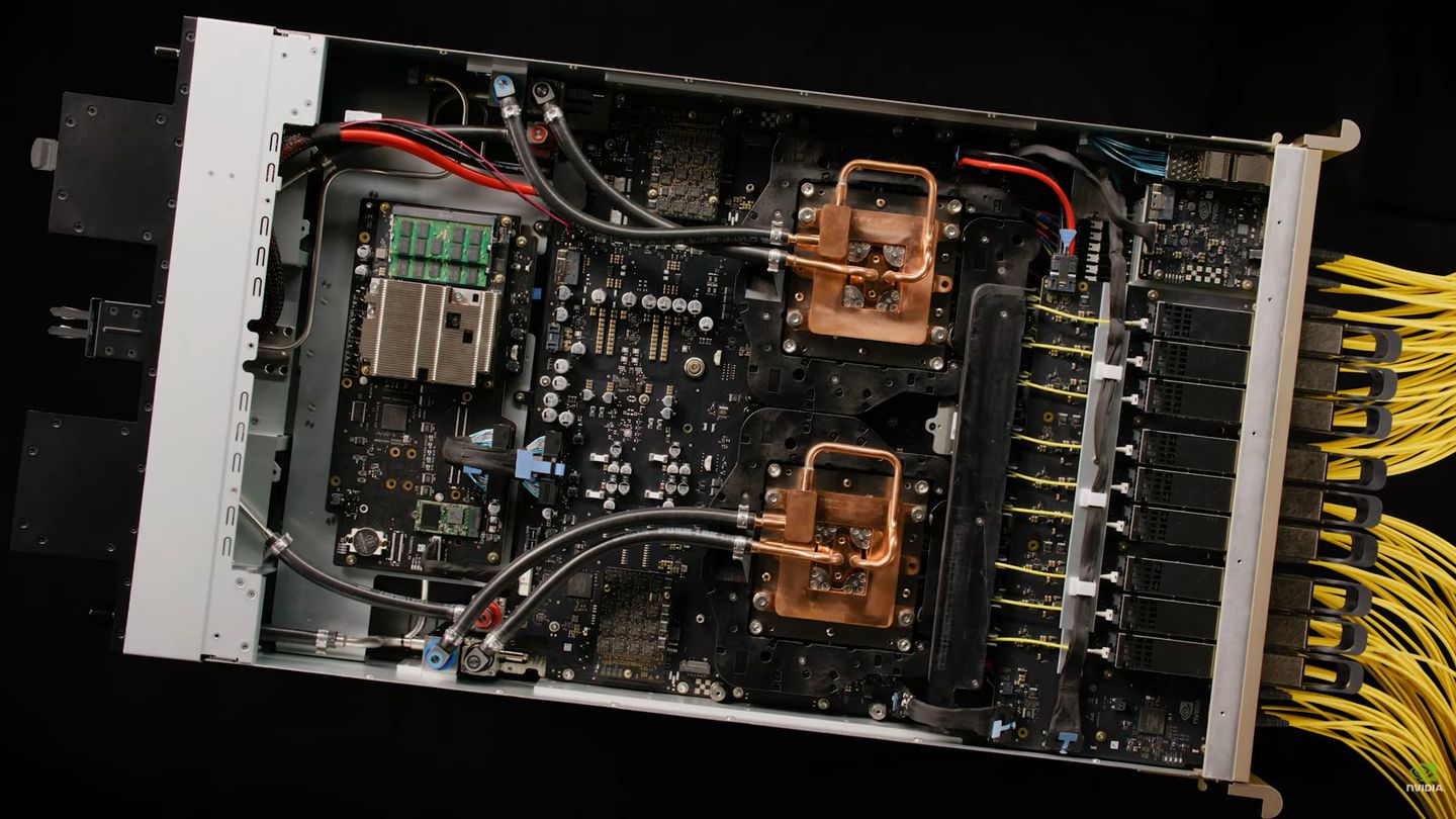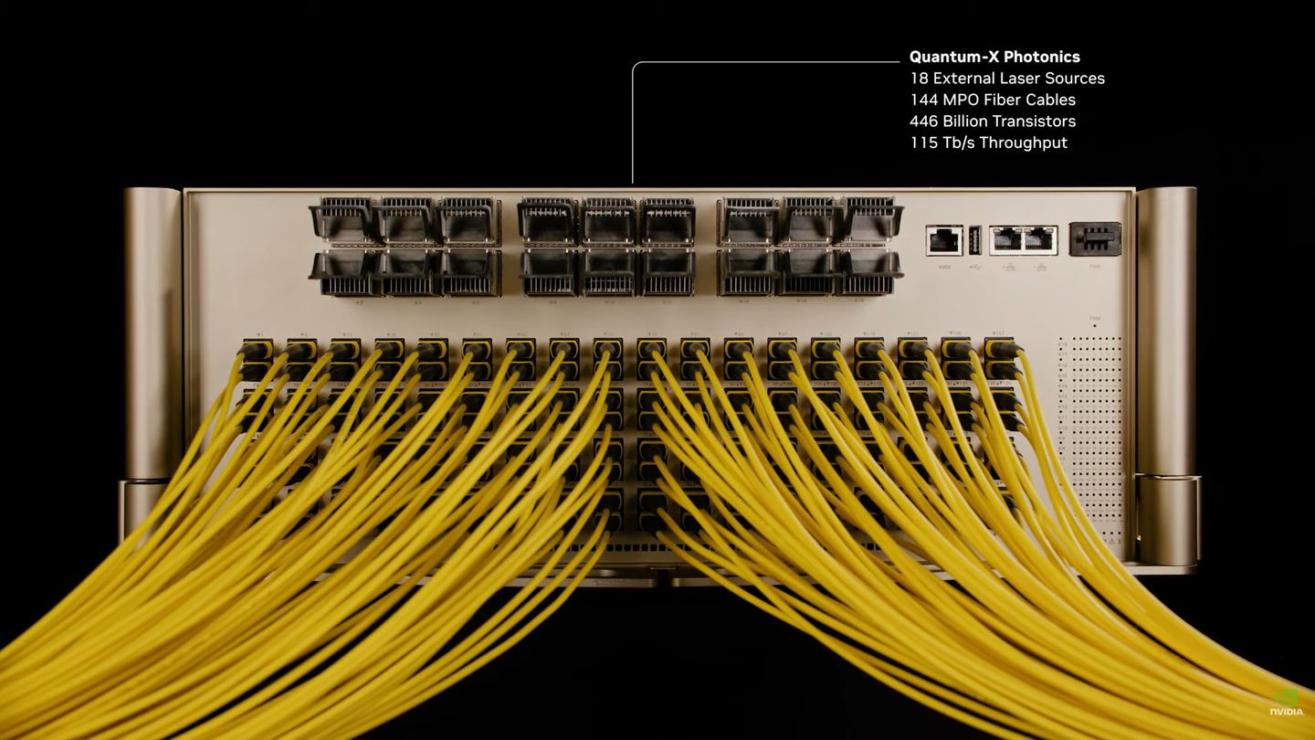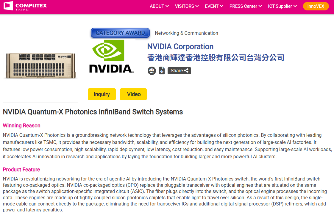 根據Nvidia網站公布的產品資訊來看,4月揭露Quantum-X Photonics交換器機型名稱是Q3450-LD,5月初確定成為獲選台北國際電腦展的Best Choice Awards的產品,該款交換器採用4U尺寸機箱,導入液態冷卻技術,並且內建144個MPO接頭的800 Gb/s InfiniBand網路埠,可透過兩層式的樹狀寬型架構連接超過1萬個GPU,11月釋出初期版本的產品。