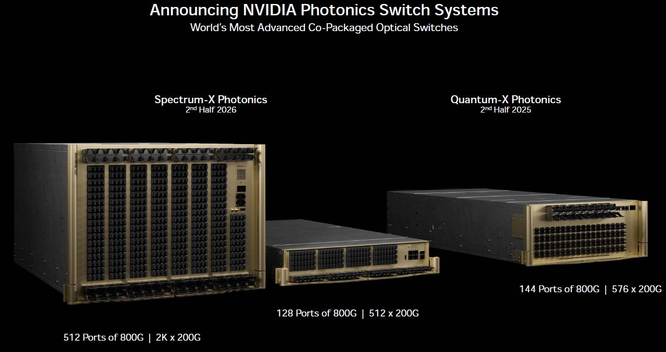 至於Spectrum-X Photonics交換器,Nvidia預告將於2026年下半推出,支援多種網路介面組態,例如,128個800 GbE埠或512個200 GbE埠,總頻寬為100 Tb/s;512個800 GbE埠或2,048個200GbE埠,總頻寬為400 Tb/s。同樣用於服務多租戶的超大型AI工廠,比起傳統乙太網路平臺,Spectrum-X Photonics交換器可提供1.6倍的網路頻寬密度。
