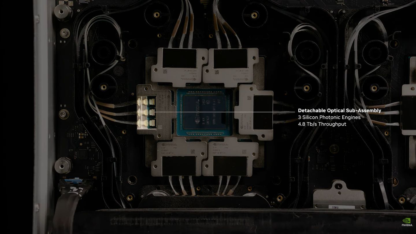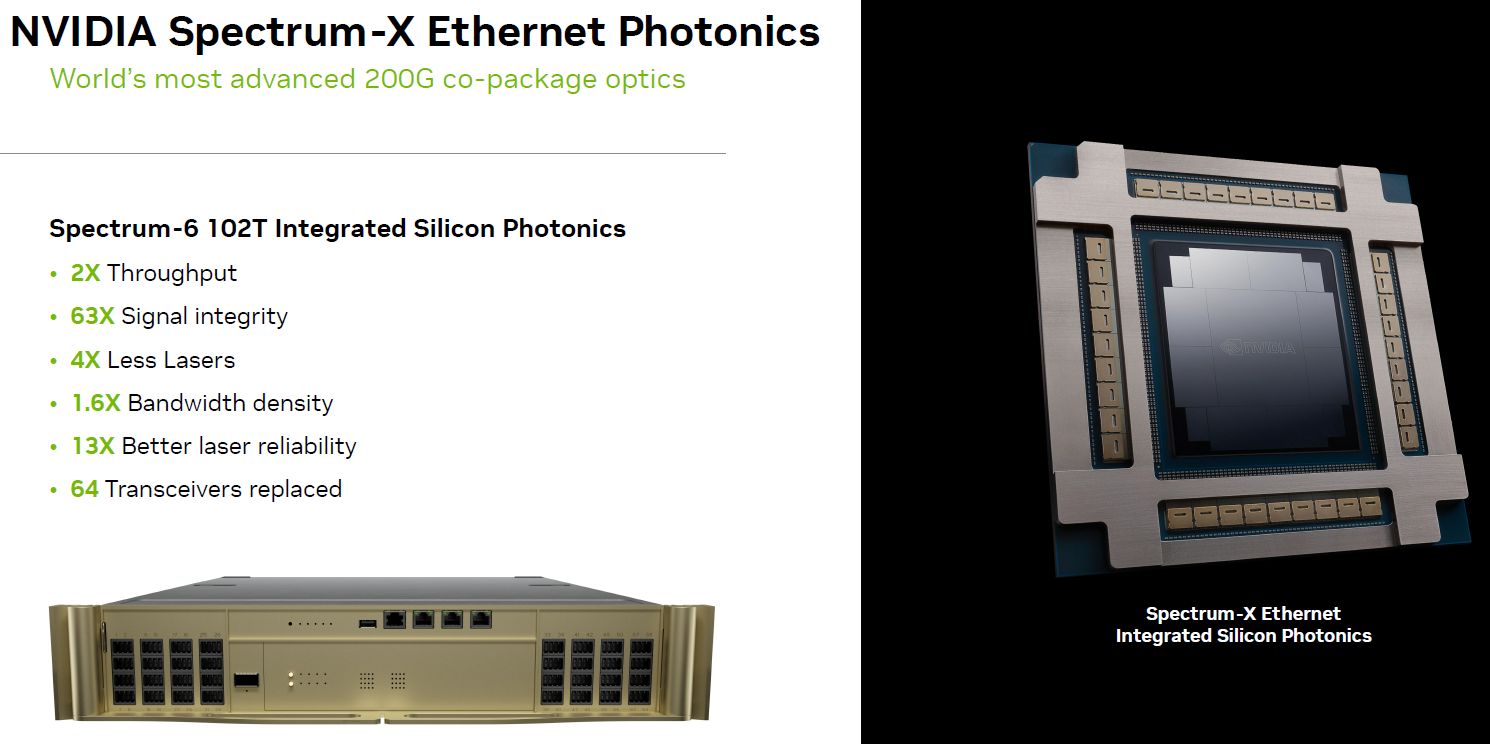 Nvidia此時也預告Spectrum-X Photonics交換器,將會採用新推出的ASIC晶片Spectrum-6,這顆晶片整合32個矽光學引擎,每個引擎提供全雙工頻寬是3.2 Tb/s,整個晶片的全雙工頻寬可達102.4 Tb/s。