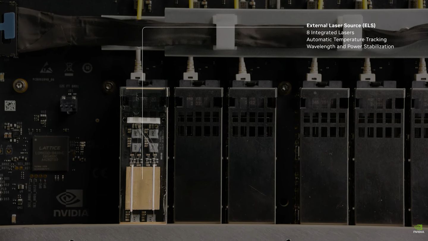 基本上,每個ELS模組包含8個雷射發射器,可透過光纖與光學引擎精準耦合,若用於Quantum-X Photonics交換器,整臺提供576個傳輸通道,每個ELS模組能支援其中32個傳輸通道;若用於Spectrum-X Photonics交換器,一顆ASIC晶片可對應16個ELS模組,4顆ASIC晶片可對應64個ELS模組。