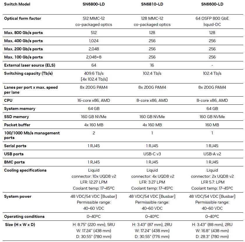 而在產品機型上,Nvidia此時明確列出3款型號,分別是:SN6800-LD、SN6810-LD、SN6600-LD,前兩者均採用MMC-12接頭的共同封裝光學網路,可提供800 GbE埠數量分別是512個與128個,若是400 GbE埠,可提供到1024個與256個;SN6800-LD與SN6810-LD能設置的ELS模組數量,依序為64個與16個,機箱尺寸分別是5U與2U。