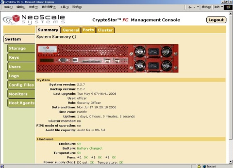 NeoScale CryptoStor FC是一套用於光纖儲存環境的資料加密系統,可為存放到儲存網路中的資料提供線速(wire-speed)的資料加密,具備3DES、AES加密機制與SHA-1/-512演算法。系統提供2個2Gb FC埠與1個管理用的Ethernet埠,並有網頁式圖形介面、命令列與LCD控制面版等3種管理方式。