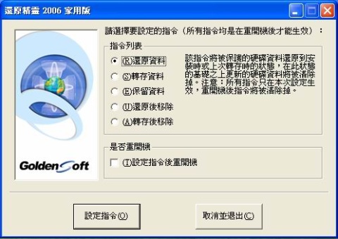 | 從工作列即可啟動還原精靈2006的設定介面,用戶可透過此介面設定還原方式、管理者密碼及其他進階選項。 |