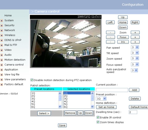 PT6114鏡頭具備水平、垂直移動功能,且隨機附有名片型遙控器,管理者可以透過遙控器、隨意改變鏡頭拍攝方向,水平最大可270度旋轉,垂直則可做135度上下擺動,以便縮小單機設備的監視死角。此外,管理者亦能透過PT6114的內嵌式網頁伺服器,在個人電腦端透過網頁的方向導航鈕改變拍攝方向,還能直接在畫面上任意點選拍攝點,直接讓鏡頭對準目標物,也能自動上下、左右固定旋轉,更可以讓管理者依監視環境,設定鏡頭擺動軌跡,定期、定點自動巡視監視環境,相較於固定鏡頭的網路攝影機,PZ6114可單機巡視大範圍,能減少監視死角。