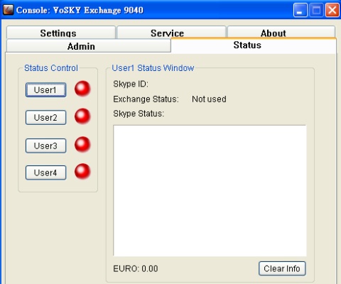 另外VoSky Exchange也有專用的管理軟體Exchange Administration Console,透過該軟體我們可以很快得知目前設備狀態,包含FXS連接埠狀態、使用的Skype帳號及設定狀態。在安裝管理軟體時,程式會依據管理者所需使用的埠數,設定相對應的使用者數,因此也需要在管理軟體上設定該帳號的密碼,否則就無法登入並設定Skype帳號。