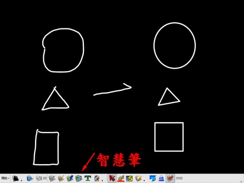 至於智慧筆功能則可增加繪製圖形時的便利性。點選控制軟體下方工具列的智慧筆選項便可開啟,如此當要繪製圓形、矩形、三角形、直線或箭號等幾何圖形時,系統會自動校正歪曲的線段,並補齊線段未連接的部分。