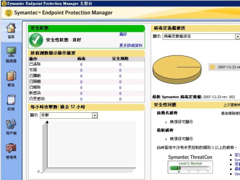 | SEP 11.0的主控臺介面與個人端的Norton Internet Security 2008風格相似,檢視管理者可以從首頁畫面,得知內部電腦是否足夠安全。 |