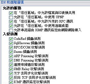 個人防火牆的類別之下包含了主機型IDS的設定,針對一些經常透過網路進行的惡意攻擊模式,Smart Security已經預先制定了檢測規則,可以感知。
