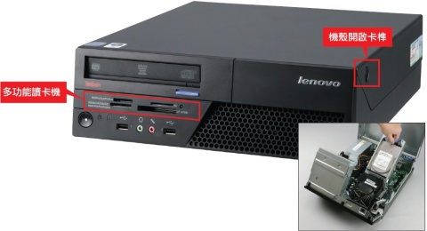 ThinkCentre全系列產品都具備免工具拆卸的內裝設計。以我們拿到的小型機體M58為例,它的光碟機槽直接連接前方面板,只要按下側面的卡榫,就可以將光碟機抽出,如果要插拔機箱內的電源線或SATA傳輸線也很方便。