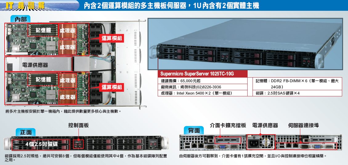 1025TC-10G在1U的機箱空間內,處理器插槽總數是4個,若都搭配4核心處理器,運算核心總共可高達16個。對於需要在有限空間,達到大量運算效能的情況,這類主機的高密度設計可滿足此種情況,而且費用相較於刀鋒伺服器也便宜許多。以我們本次借測的1025TC-10G來說,空機售價僅65,000元,與一般刀鋒伺服器含機箱動輒超過10萬元相比,多主機板伺服器的價格較低;而配備完整的多主機板伺服器售價,大約在120,000至200,000元之間,其差別依照規格配備的各自考量而有不同,但相對於購買兩臺規格相同的1U伺服器,仍便宜一些。