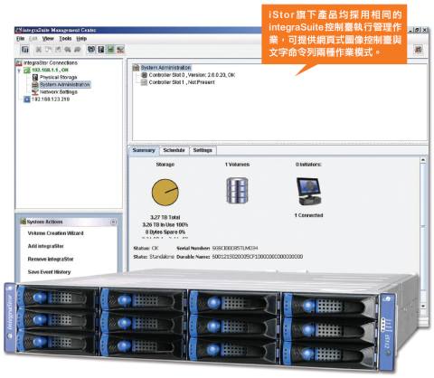 如同其他iSCSI產品,iS512-10G的建置與設定亦相當簡便,無論從RJ-45管理埠或10GbE資料埠,都能登入系統的integraSuite控制臺,執行系統設定工作。