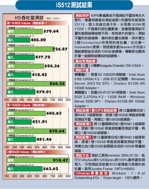 另外若建立的iSCSI Session越多,則測得的傳輸率也越高。換言之,在iS512-10G上建立3個33GB磁碟區,分別掛載到測試平臺後再合成一個100GB的磁碟區,得到的傳輸率會略高於直接建立單一100GB磁碟區(前者與主機以3個Session連接,後者則只有1個Session)。