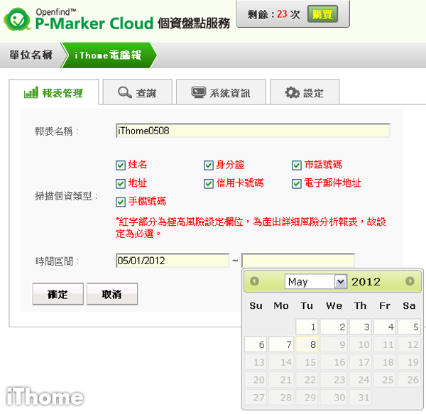 在管理頁面,IT人員能夠自行設定個資欄位及時間區隔輸出報表,須注意的是,個資欄位為紅色與高風險設定中預設的欄位相同,不能夠取消。