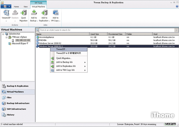 而6.1版則另外新增VeeamZIP備份模式,這是快速的一次性完整備份功能,利用VeeamZIP,可將指定的VM建立單一的.vbk備份檔案,這等同於一個該VM在特定時間點狀態下的完整備份。