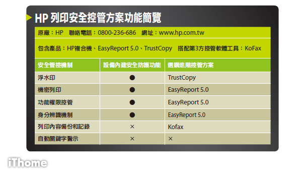 在HP所提供的列印安全控管方案中,除了該廠牌設備上既有的網頁式管理介面,HP還可以搭配的是第3方軟體Epsoft EasyReport 5.0協助管控,此外,安全浮水印機制中,與多數廠商較為不同的是,重視防偽列印的功能,因此HP具有3道防偽影印的浮水印機制,以加強防止文件偽造,並提升保密層級。