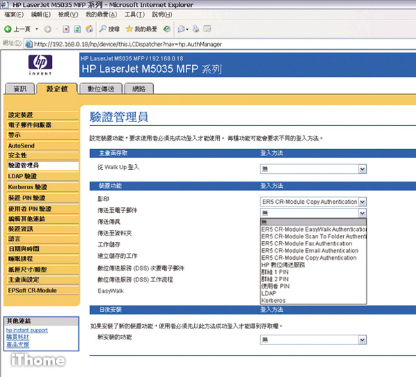 在功能權限控管方面,我們可從各臺設備EWS(Embedded Web Server)的網頁式管理介面中,設定各個功能的驗證方式。在驗證管理員選單中,我們可以針對該裝置上的功能選單,選擇登入驗證方法,例如針對影印、傳送至電子郵件、傳送傳真、傳送至資料夾等功能,分別設定其驗證方式,如LDAP、使用者Pin碼、以及讀卡機等模組功能。此外,在身份驗證上,HP也提供生物辨識的解決方案,像是採用指紋辨識的方式,應用在列印設備上。