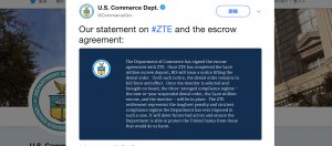 美國商務部解除對中興的銷售禁令,中興須支付10億美元罰款、緩刑10年的出口禁令,並繳交4億美元保證金,同時換掉該公司董事會與高層,並且成立合規團隊,以確實執行美國的出口管制。