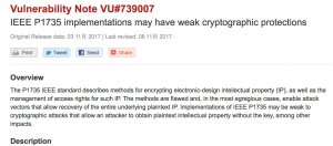 US-CERT指出IEEE P1735標準的7個安全漏洞,可能讓駭客得以解密IP、修改加密的IP或是加密金鑰以安裝硬體木馬,或是破解IP的存取控制等,最嚴重者可取得明文的智慧產權內容。