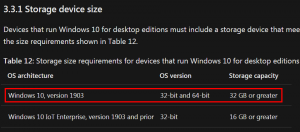 微軟官方資料顯示,要安裝32-bit或64-bit版本的Win 10 1903版,電腦都需具備32GB以上的儲存空間