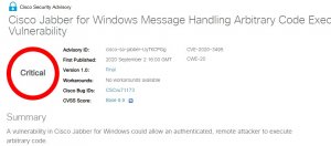 思科9月2日發布的安全更新中,CVE-2020-3495漏洞存在於Cisco Jabber for Windows中,駭客只要傳送一個特製的訊息就能開採,並自遠端執行程式