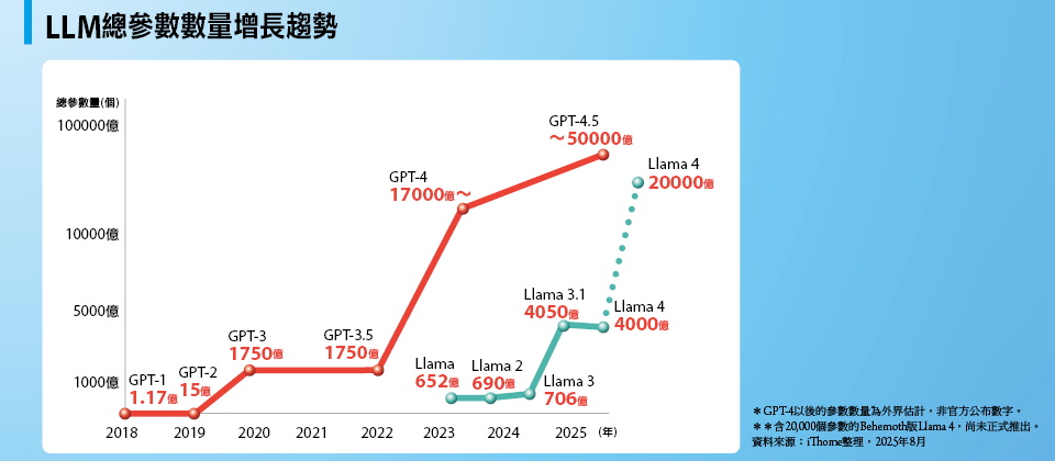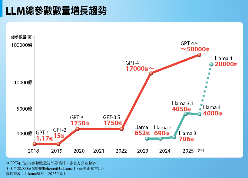 以最具代表性的OpenAI GPT為例,自2018年推出的GPT-1起,到2025年初發表的GPT-4.5,模型包含的參數量在8年內增加3萬倍以上。如果只看2020年以後,從GPT-3到GPT-4.5的總參數量也增加20到30倍。對照開源LLM最具代表性的Meta Llama,總參數數量也在兩年半內增加30倍。