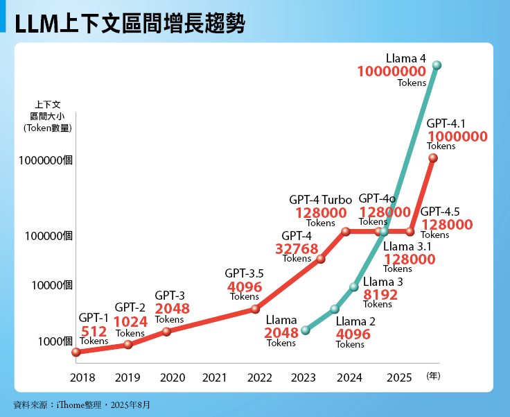 以Open AI的GPT為例,自最早的GPT-1,到今年初發表的GPT-4.1,支援的上下文區間從512個Token提高到100萬個Token,提高將近2,000倍,從GPT-3起算,也提高將近500倍。而開源領域的Meta Llama,更從Llama的2,048個Token提高到Llama 4的1,000萬個Token,增長近5,000倍。