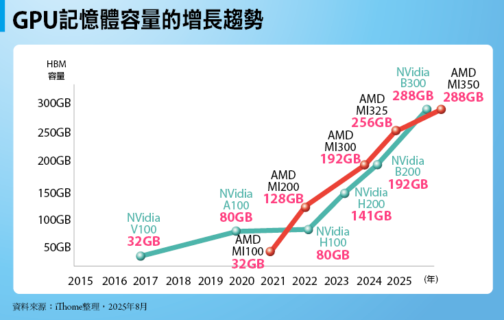 過去7、8年來,資料中心級GPU的HBM記憶體容量,大致以每一世代提升30%到50%的幅度增長,以Nvidia HGX系列GPU為例,從V100到B300的記憶體容量足足提高9倍,對照AMD的Instinct系列GPU,從MI100到最新的MI350,在5年內也提高9倍,都稱得上相當顯著的增長。
