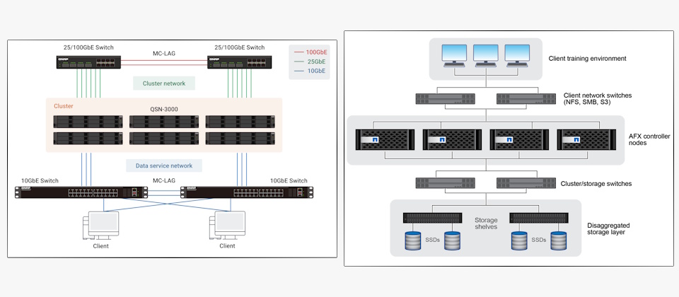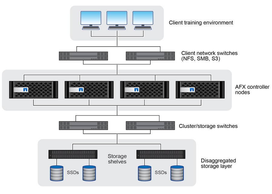 這裡以NetApp的AFX,作為分解式儲存叢集架構的範例。AFX的叢集節點分為控制器節點,以及儲存機箱等兩種,個別控制器節點或儲存機箱,都不具備獨立運作能力,而需彼此連結組合運用,所以所有控制器節點都透過後端的叢集/儲存交換器彼此互連,控制器節點另外再經由前端的用戶端網路交換器,提供S3。NFS/SMB等儲存服務。圖片來源/NetApp