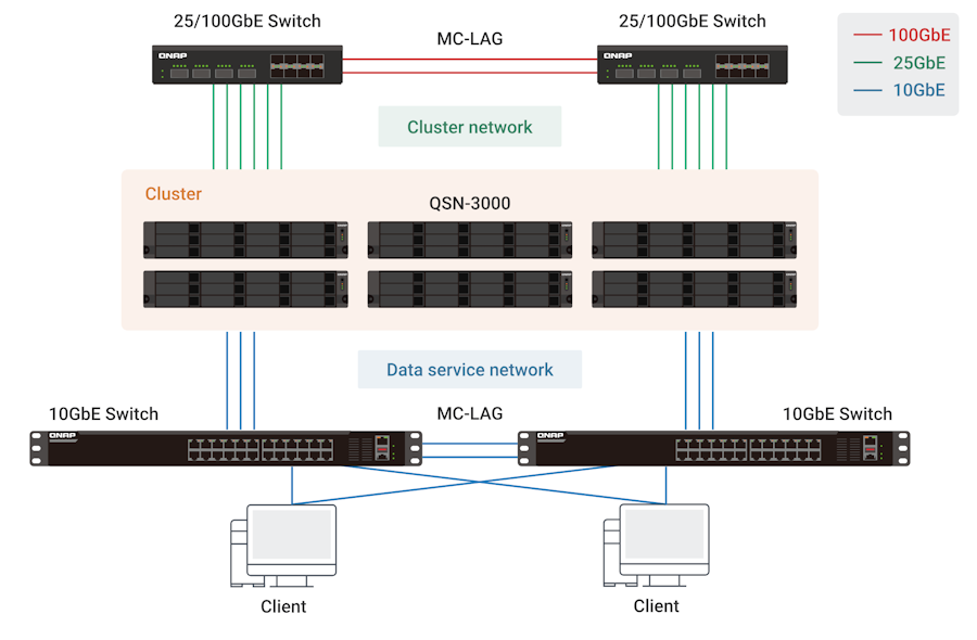 我們以QNAP的Scale-Out NAS,作為無共享式儲存叢集架構的範例,叢集節點只有QSN-3000一種,每1臺QSN-3000節點都有完整的處理器、記憶體與儲存空間資源,各節點透過後端的叢集網路互連,提供高可用性與資料保護功能,並透過前端的資料服務網路連接用戶端,為用戶端提供基於S3、NFS/SMB的物件與檔案儲存服務。圖片來源/QNAP