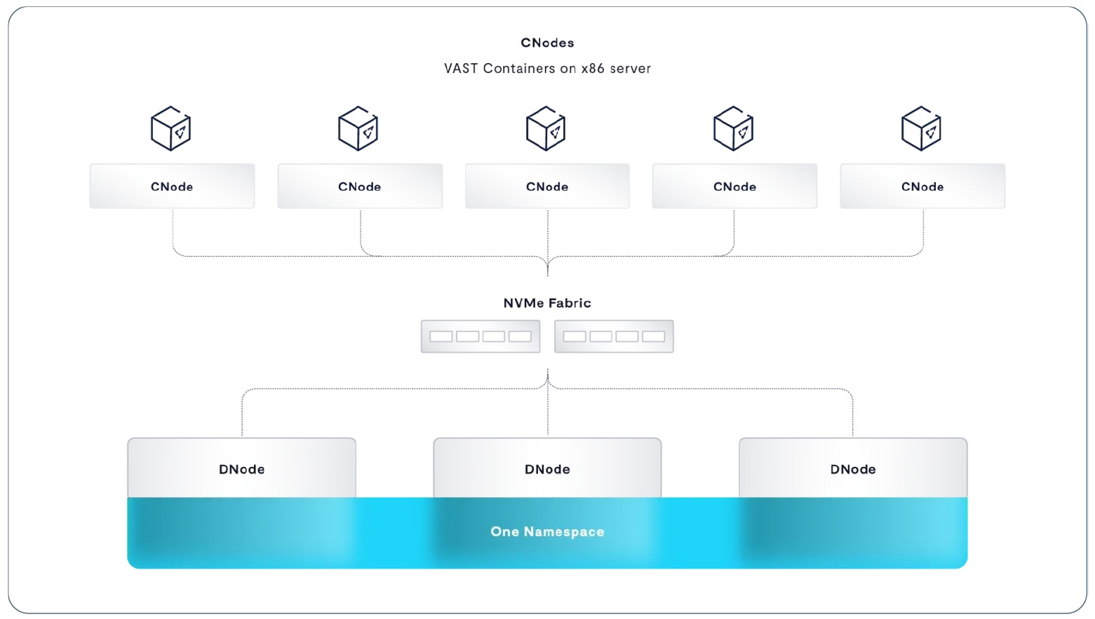 DASE由稱作CNode的運算節點,與稱作DNode的NVMe JBOF機箱(早先曾稱為Databox)等兩種節點組成叢集,彼此透過基於NVMe-oF協定的100GbE網路互連。