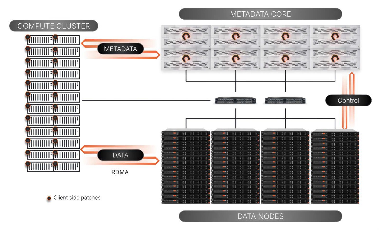 FlashBlade//EXA是Pure Storage的FlashBlade物件與檔案儲存陣列家族中,專門針對AI與HPC應用發展的新版本,採用pNFS平行存取架構,由負責metadata處理的MetaData核心節點(Metadata Core Node),與負責資料I/O的資料節點(Data Node)組成。