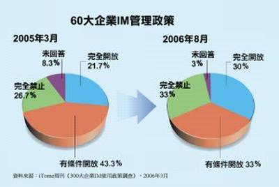 也有少數的公司,原本是完全禁止,轉變成為完全開放,或是有條件式的開放,這一些企業大多是考量到即時通訊仍然可以為企業帶來某一部分的好處,不過在不希望全公司大規模的從完全禁止,一下改變到完全開放,因此,許多企業就採取有條件的管理政策。